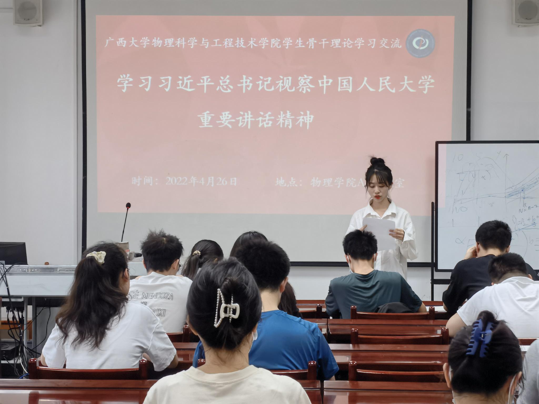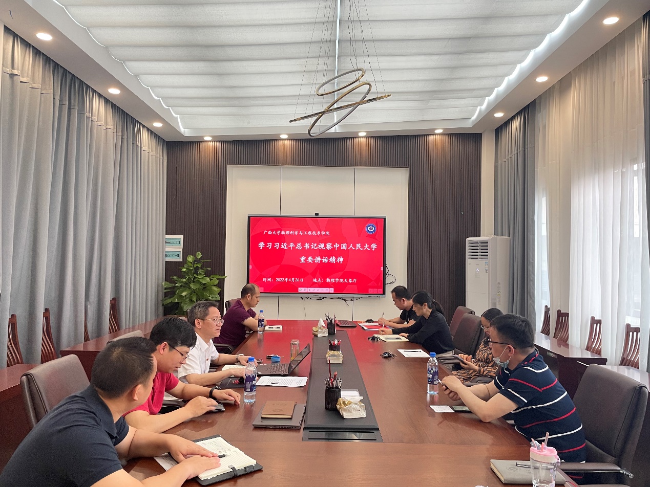 学院领导班子成员中心组理论学习会上,结合自身工作实际,分别畅谈体会感想。常务副院长王祥高提出,习近平总书记重要讲话对中国高等教育办学方向提出了明确方向,结合新一轮一流学科建设,我们要坚持走中国特色社会主义的一流大学道路,物理学院要把课程思政、解决卡脖子问题、夯实基础教育等三个方面结合起来,坚持学科特色的发展,把习近平总书记的思想作为核心深化到实际工作中来,服务广西、建设广西、为壮美广西贡献应有力量。
