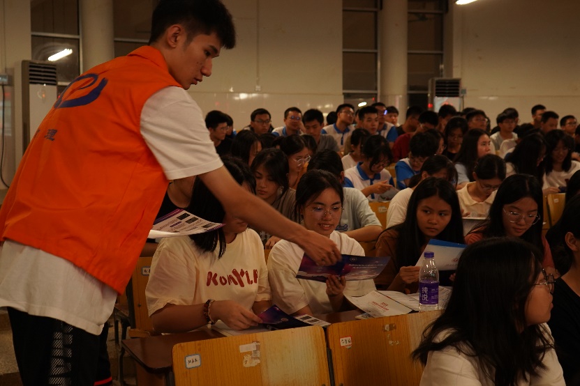 7月6日,在大新县德天大众广场,学生们积极参与资助政策宣传活动,向当地居民发放资助政策宣传册,详细介绍了国家助学贷款申请流程。晚上,研学团前往大新中学,开展学生资助政策和成效宣传、天文科普志愿服务、学业指导讲座等活动。