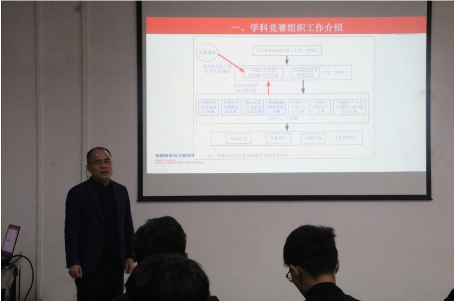 历年在参加各类比赛中的成功经验,鼓励同学们积极报名,展现才华。在交流环节,陆副院长耐心解答同学们的疑问、给予指导,并鼓励大家除了参加这些专业的比赛外,还要积极参加全国大学生物理实验竞赛、“互联网+”大学生创新创业大赛、“挑战杯”全国大学生课外学术科技作品竞赛等,并表示学院将大力提供资源和支持。