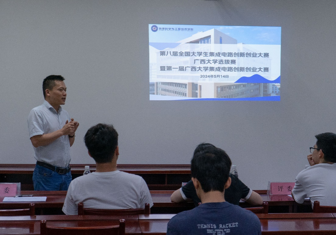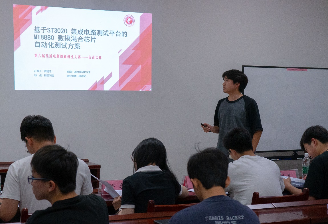 集成电路创新创业大赛在物理学院D913教室开展。电子科学与技术、集成电路设计与集成电路系统、物理学三个专业的48名学生,物理学院集成电路课专业教师参加了本次选拔赛。
