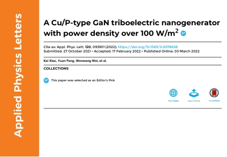 孙文红团队在Nature Index著名学术期刊《Applied Physics Letters》上发表了题为“A Cu/P-type GaN triboelectric nanogenerator with power density over 100 W/m2”的研究论文。该论文被编辑选为“Editor's Pick”文章,在APL官网麻豆av加以重点展示(Editor's Picks serve to highlight articles with excellent scientific quality and are representative of the work taking place in a specific field)。