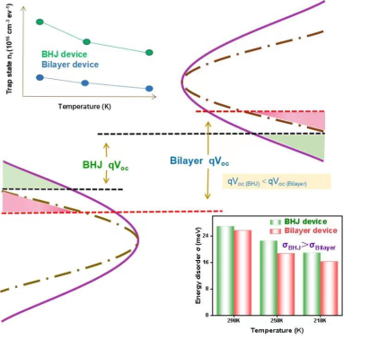 薄膜光伏团队通过选用具有较大IE偏移的PM6/N3组合作为活性层,通过正交溶剂法制备了PHJ OSCs,实现了最高的18.1%效率,高于其BHJ OSCs的17.1%,为目前报道的PHJ OSCs的最高效率。在此,四种方法被用来探测两种器件中的能级紊乱度,结果表明,由PHJ为活性层的OSCs的能级紊乱度减小了大约3-5meV。而且DLTS与DoS测量结果也证实了PHJ OSCs拥有比BHJ OSCs更小的缺陷态密度,同时,更大的载流子迁移率与更少的双分子复合也被证实。基于此,更大的电压与填充因子被得到,并最终实现了高达18.1%的二元PHJ OSCs。并且,由于PHJ OSCs更好的形貌稳定性,也使其效率更稳定。相关工作已经在中科院一区TOP期刊《ACS Materials Letters》(IF:11.170 DOI: //doi.org/10.1021/acsmaterialslett.3c00236)上发表。