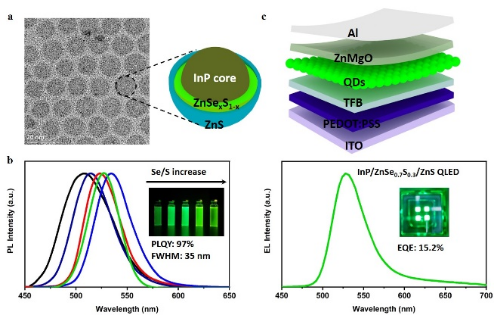 胶体量子点由于其优异的发光性质,被认为是下一代发光显示和固态照明领域最具潜力的材料之一。与经典的镉基和铅基量子点相比,InP基量子点不含重金属元素,其发光颜色可以覆盖整个可见光范围。然而,作为人眼最敏感的绿光,其相应的InP基量子点发展还相对滞后。因此,发展高性能绿光InP基量子点及其发光二极管在显示和照明等领域中具有极其重要的科学意义和应用价值。