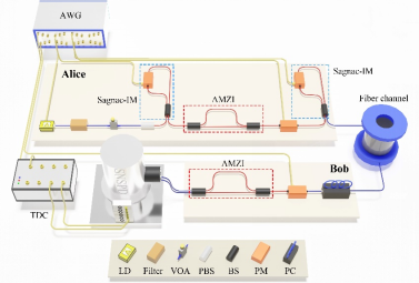 参考系无关量子密钥分发(Reference-frame-independent QKD, RFI-QKD)协议,使Alice和Bob能够在缓慢变化的参考系中共享安全的密钥,而无需实时校准,引起了广泛关注。目前,标准诱骗态RFI-QKD的传输距离已被推高至175 km,重复频率为100 MHz。然而,其通信距离和重复频率明显低于更成熟的BB84 QKD,BB84 QKD的重复频率为GHz,距离最高达到421 km。