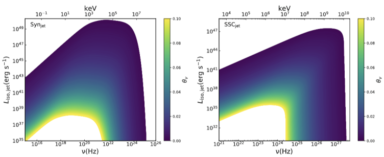 图2:激波加速电子同步辐射(左)和同步自康普顿辐射(右)随视角的变化