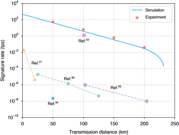 在本研究中,研究团队提出了一种基于芯片的QDS网络,并通过发展单诱骗态一次全域哈希QDS协议,提高该网络性能的同时,降低了系统的复杂度。随后通过硅基编解码芯片构建了一个三节点QDS网络开展实验验证。实验结果表明在200 km的通信距离下,签名1 Mbit文件签名速率达到了0.04次每秒。研究团队表示,这一研究不仅推动了QDS技术的实用化进程,还在量子电子商务、量子区块链等其他量子通信领域具有广泛的应用价值。