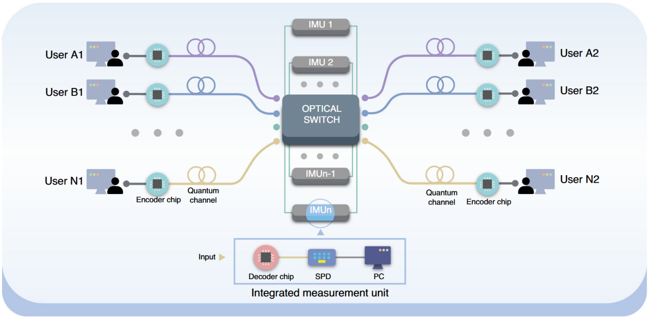 图1为合作团队提出的芯片嵌入的星型QDS网络架构。将复杂且难以集成的测量设备集中部署在网络中心节点。而每个用户只需持有一个小型化和低成本的发射器芯片即可在不同用户间执行数字签名任务。此外,这种网络架构能够集成到现有的通信基础设施中,并且通过灵活配置集成测量单元(IMU),使其能够适用测量设备无关类协议,从而提升网络性能。