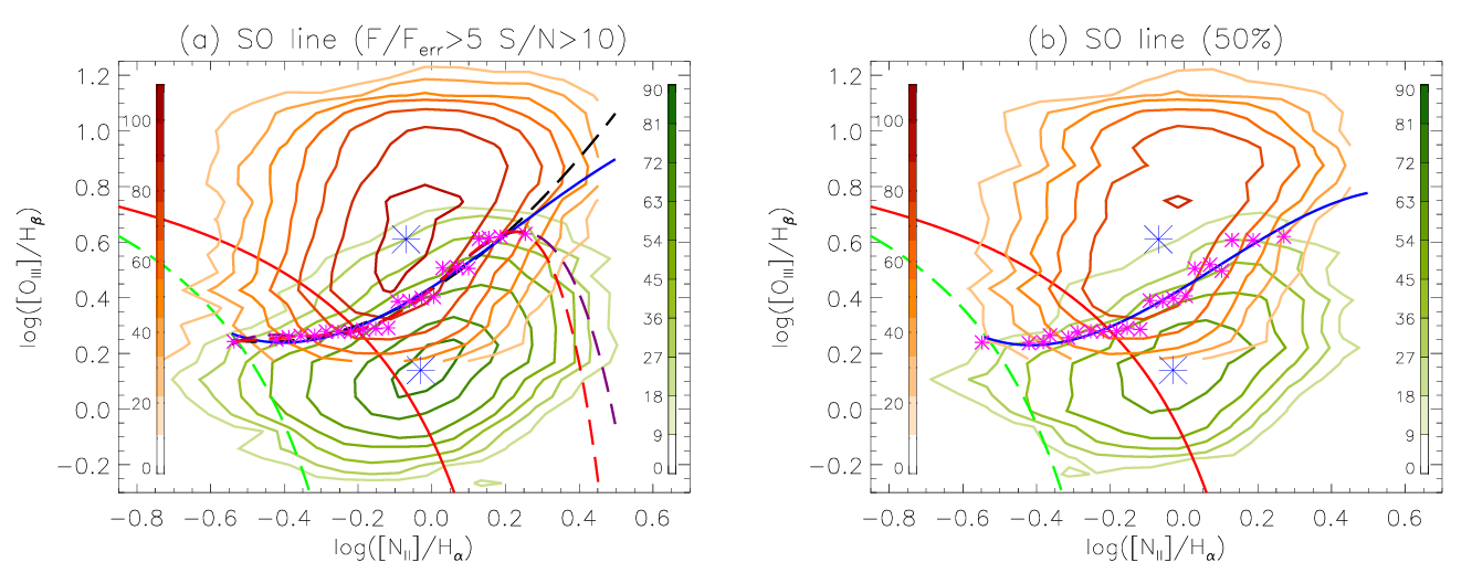在该项工作中,考虑到目前在[NII]分类图中并没有明确的Seyfert和LINERs的分界线,我们提出了一个优化的方法,对该分界线进行了标定,并且基于该分界线,首次报道了1型和2型AGN中的数目比与LINERs的数目比有较大的差异,从而为非AGN起源的LINERs或者naked LINERs的后续研究打下了基础。后续关于1型以及2型LINERs的研究正在有序进行中。