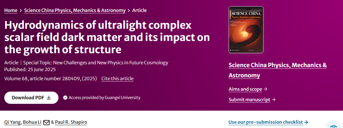 近日,我院宇宙学团队在暗物质研究领域取得新进展。研究结果以题目为“Hydrodynamics of ultralight complex scalar field dark matter and its impact on the growth of structure”的论文发表在中国科学院一区期刊Science China Physics, Mechanics & Astronomy (SCPMA)。论文的第一作者为麻豆AV