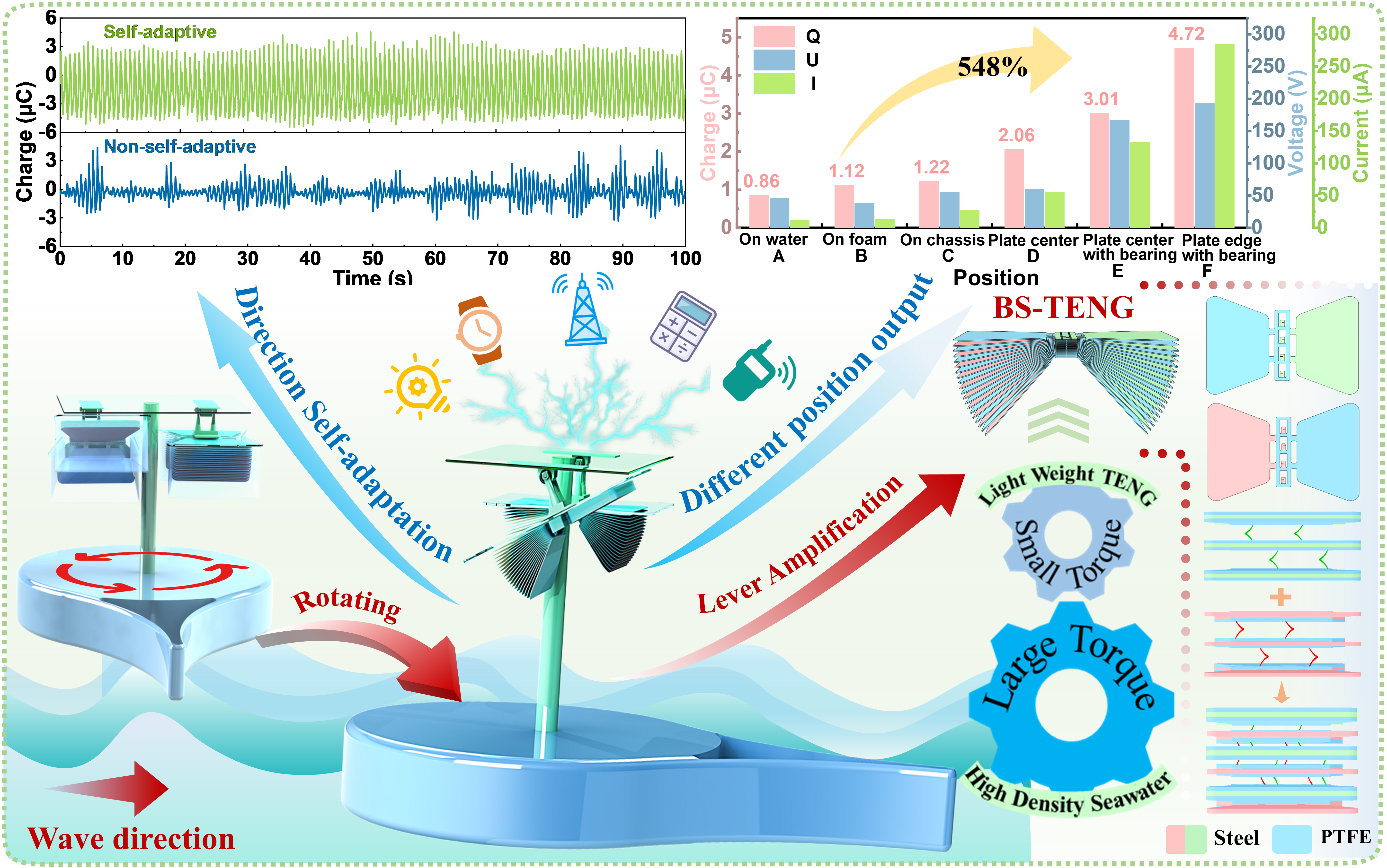 蓝色能源团队设计了基于自适应平台的仿生向日葵方向调整策略以及相应的新型蝶形堆叠摩擦纳米发电机(Butterfly-stacked triboelectric nanogenerator, BS-TENG)。该系统不仅可以在无额外电力消耗下自动调整自适应平台朝向使其对准波浪方向,从而使悬挂其上的BS-TENG高效捕获波能。还利用了杠杆原理将低振幅、高扭矩的波浪能转化为高振幅、低扭矩的动能,从而使致密摩擦层能够充分地接触分离,在弱波条件下与直接漂浮水面的BS-TENG相比,基于自适应平台的BS-TENG电荷输出提高了548%,显著提高了能量利用率。BS-TENG由半覆膜激光蚀刻的Si-Mn 弹簧钢板制成,消除了内部布线、框架和惯性质量。这种超轻设计简化了制造和材料消耗,实现了6.75 cm²g-1的质量摩擦面密度(SSA)。系统研究了该平台的工作机理和输出特性,单个BS-TENG的最大转移电荷量达到了13.68 μC,并证明了有效收集弱波能量为多个电子设备供电的可行性。该策略可与各种收集波浪能的TENG 轻松集成,为弱波浪能收集提供了一种可扩展且经济高效的解决方案。