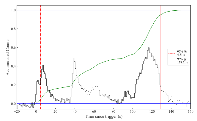 本文通过对GRB 161117A的Fermi/GBM观测数据的能谱分析,发现其光谱演化呈现出从热辐射(单一黑体谱,BB谱)到混合谱(幂律谱PL+黑体谱BB),最终演化为非热辐射(Band与CPL)的转变过程。这种转变表明GRB 161117A的喷流成分应从早期的火球逐渐转变为坡印廷流主导的喷流。基于两种模型(纯火球模型与混合模型)中观测到的准热辐射成分,可推导出喷流的洛伦兹因子、光球半径、中心引擎半径、中心引擎处的磁化因子以及无量纲熵等参数。结果显示,中心引擎半径约为10⁸cm。在最初七个时间区间内,低磁化因子与高无量纲熵的特征表明该阶段喷流为纯火球。此外,通过晚期非热辐射谱可估算光球半径处磁化参数的下限(下限约等于1),该结果说明粒子加速机制主要受内部激波主导,而非磁耗散过程。最后,本文还探讨了中微子主导吸积流模型中中微子湮灭机制对GRB 161117A热辐射现象的解释可能性。